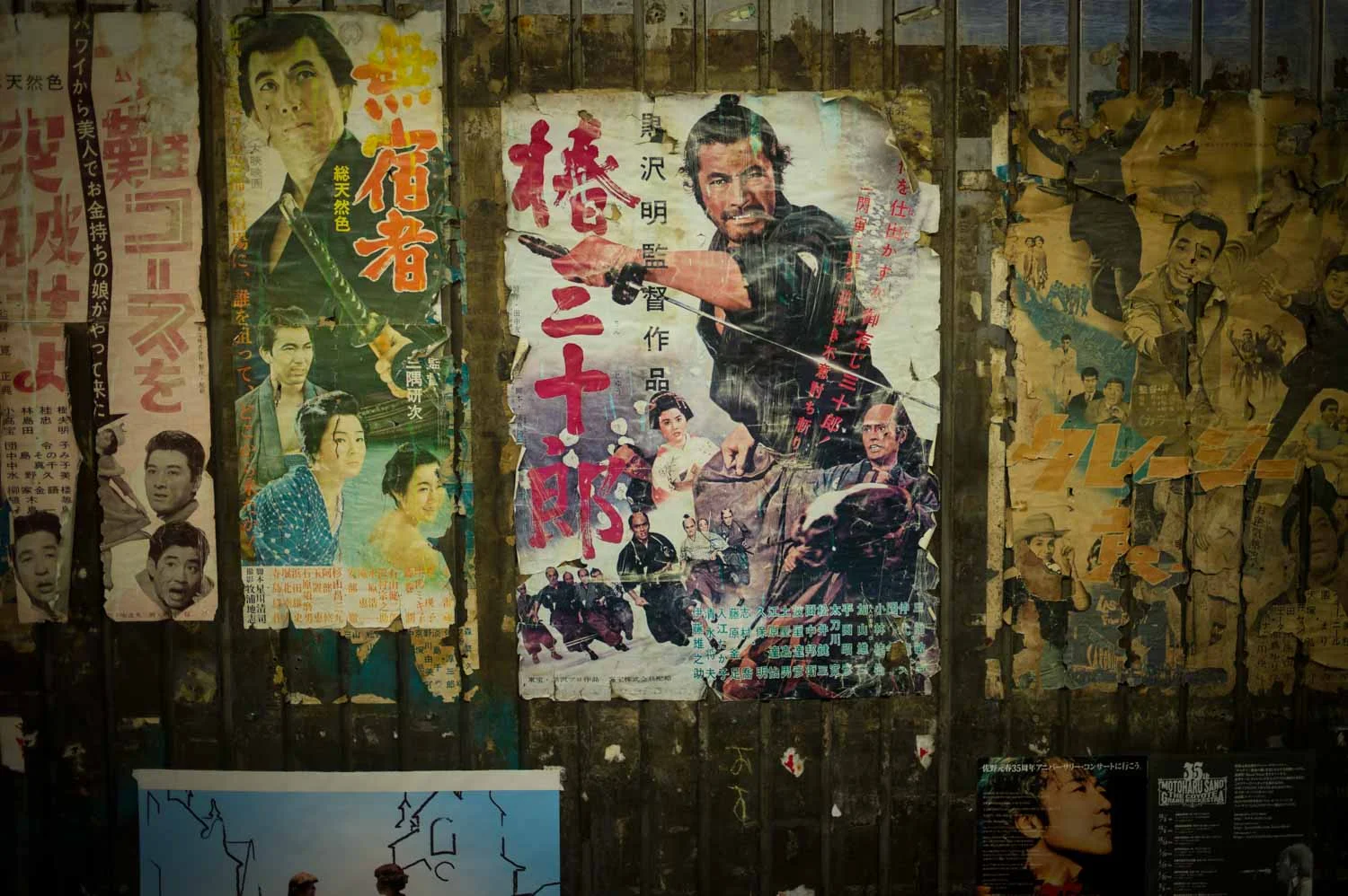 I love this wall of old Samurai movie posts. They are all ripped up and tattered. Reminds me I should watch some old samurai movies again.