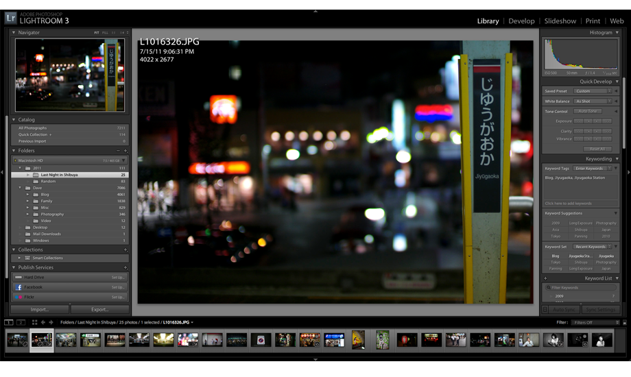 After I have my keepers I do some simple tagging of the meta data to make them easier to find later. For example, this photo of the Jiyugaoka Train Station that I am putting on my blog I might tag as; blog, Jiyugaoka, Jiyugaoka Station.